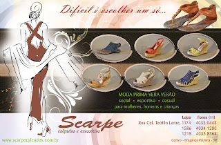 Contamos as estações com as coleções da Scarpe presentes no site e nos anúncios na Revista dos Famosos da região, a PERFIL E FAMA. Trata-se de anúncio de meia página. Faremos um para dezembro com jeito de festas… a Donna apoderia estar segurando um espumante? quiça calçando sapatos vermelhos? Que terapia que nada, é a frase que uso para “curtir” os sapatos no face book.