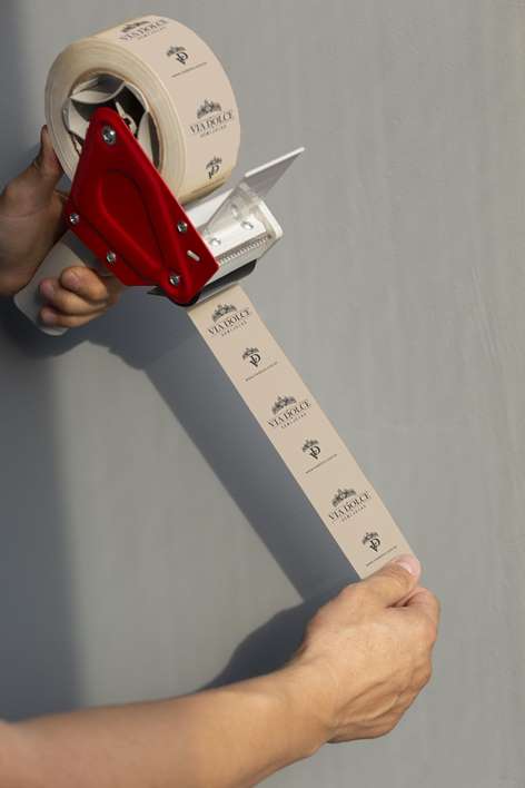 A fita pode ser translucida com impressão da arte.. Pode ser também de adesivação simples ou gomada.